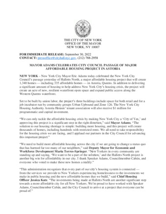 MAYOR ADAMS CELEBRATES CITY COUNCIL PASSAGE OF MAJOR AFFORDABLE HOUSING PROJECT IN ASTORIA