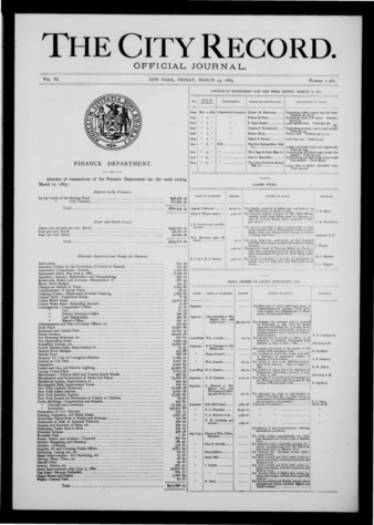 The City Record newspaper publishes notices which includes but is not limited to: public hearings and meetings, public auctions and sales, solicitations and awards and official rules proposed and adopted by city agencies. This is the City Record Newspaper for March 23, 1883.