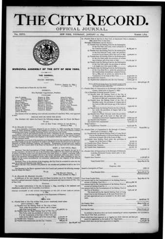 The City Record newspaper publishes notices which includes but is not limited to: public hearings and meetings, public auctions and sales, solicitations and awards and official rules proposed and adopted by city agencies. This is the City Record Newspaper for January 12, 1899.