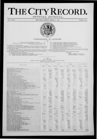 The City Record newspaper publishes notices which includes but is not limited to: public hearings and meetings, public auctions and sales, solicitations and awards and official rules proposed and adopted by city agencies. This is the City Record Newspaper for March 21, 1899.