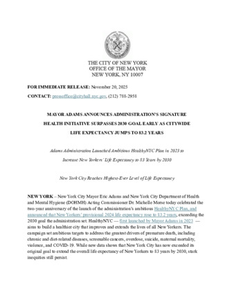 Mayor Adams Announces Administration’s Signature Health Initiative Surpasses Goal