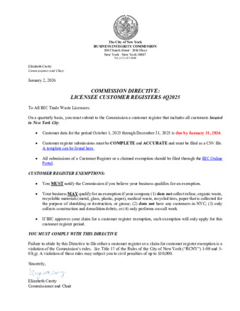 To All BIC Trade Waste Licensees: On a quarterly basis, you must submit to the Commission a customer register that includes all customers located in New York City. - Customer data for the period October 1, 2025 through December 31, 2025 is due by January 31, 2026.