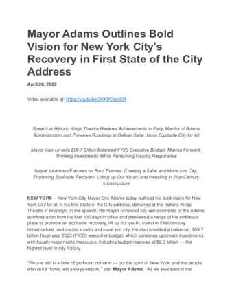 Mayor Adams Outlines Bold Vision for New York City's Recovery in First State of the City Address
