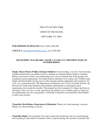 A transcript about New York City Mayor Eric Adams and Department of Education (DOE) Chancellor David Banks celebrating the first week of the Summer Rising program.