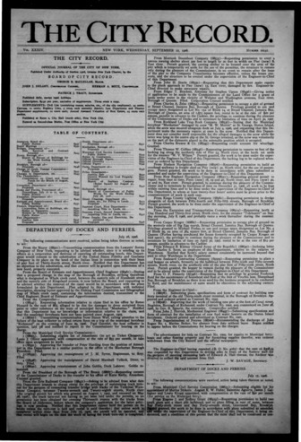 The City Record newspaper publishes notices which includes but is not limited to: public hearings and meetings, public auctions and sales, solicitations and awards and official rules proposed and adopted by city agencies. This is the City Record Newspaper for September 12, 1906.