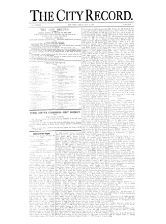 The City Record newspaper publishes notices which includes but is not limited to: public hearings and meetings, public auctions and sales, solicitations and awards and official rules proposed and adopted by city agencies. This is the City Record Newspaper for July 15, 1910 .