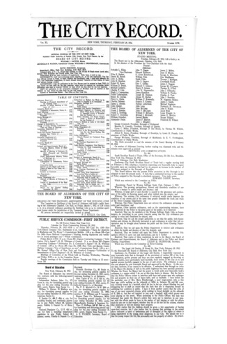 The City Record newspaper publishes notices which includes but is not limited to: public hearings and meetings, public auctions and sales, solicitations and awards and official rules proposed and adopted by city agencies. This is the City Record Newspaper for February 29, 1912.