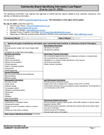 Community Board 15 Brooklyn's Identifying Information Law Report. The Identifying Law requires City Agencies to submit biennial related to their collection, disclosure and retention of identifying information.