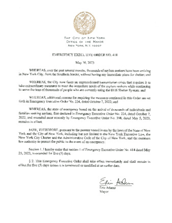 Emergency Executive Order No. 418, is being submitted to extend Emergency Executive Order No. 414, dated May 25, 2023, for five (5) days, if this relates to the state of emergency based on the arrival of thousands of individuals and families seeking asylum.