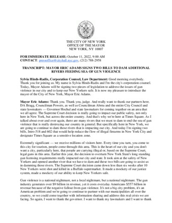 TRANSCRIPT: MAYOR ERIC ADAMS SIGNS TWO BILLS TO DAM ADDITIONAL RIVERS FEEDING SEA OF GUN VIOLENCE