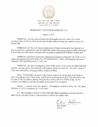 Emergency Executive Order No. 758, is being submitted to extend Emergency Executive Order No. 755, dated February 27, 2025, for five (5) days as it relates to the state of emergency based on the arrival of individuals and families seeking asylum.