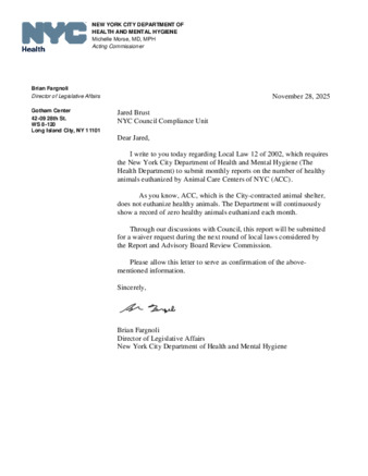 The NYC Health Department submits the Report on Number of Healthy Animals Euthanized by Animal Care Centers of NYC pursuant to Local Law 12/2002.