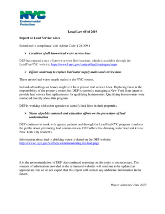 Local Law 65 of 2019, requires the Department of Environmental Protection to make information about known lead water service lines available on the city's website, available via LeadFreeNYC.