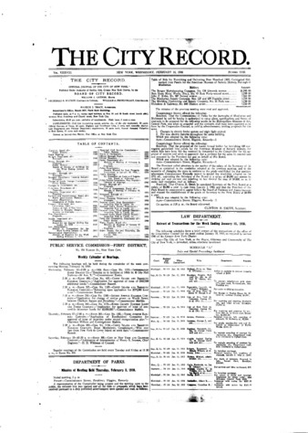 The City Record newspaper publishes notices which includes but is not limited to: public hearings and meetings, public auctions and sales, solicitations and awards and official rules proposed and adopted by city agencies. This is the City Record Newspaper for February 16, 1910.