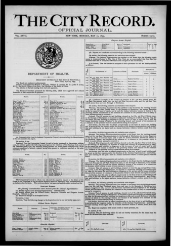 The City Record newspaper publishes notices which includes but is not limited to: public hearings and meetings, public auctions and sales, solicitations and awards and official rules proposed and adopted by city agencies. This is the City Record Newspaper for May 15, 1899.