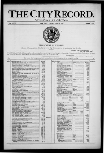 The City Record newspaper publishes notices which includes but is not limited to: public hearings and meetings, public auctions and sales, solicitations and awards and official rules proposed and adopted by city agencies. This is the City Record Newspaper for June 16, 1899.