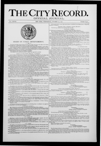 The City Record newspaper publishes notices which includes but is not limited to: public hearings and meetings, public auctions and sales, solicitations and awards and official rules proposed and adopted by city agencies. This is the City Record Newspaper for October 24, 1900.