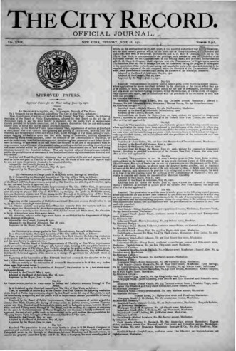 The City Record newspaper publishes notices which includes but is not limited to: public hearings and meetings, public auctions and sales, solicitations and awards and official rules proposed and adopted by city agencies. This is the City Record Newspaper for June 18, 1901.