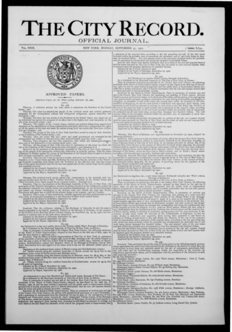 The City Record newspaper publishes notices which includes but is not limited to: public hearings and meetings, public auctions and sales, solicitations and awards and official rules proposed and adopted by city agencies. This is the City Record Newspaper for September 30, 1901.