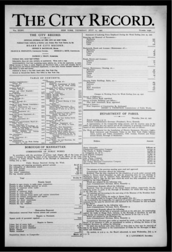 The City Record newspaper publishes notices which includes but is not limited to: public hearings and meetings, public auctions and sales, solicitations and awards and official rules proposed and adopted by city agencies. This is the City Record Newspaper for July 11, 1907.