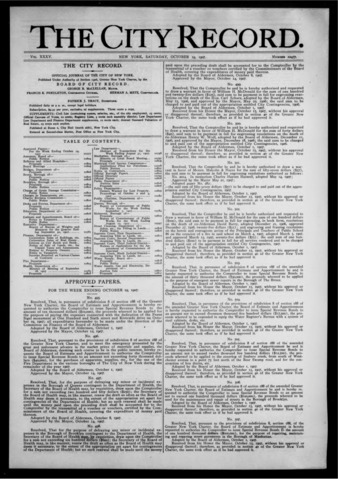 The City Record newspaper publishes notices which includes but is not limited to: public hearings and meetings, public auctions and sales, solicitations and awards and official rules proposed and adopted by city agencies. This is the City Record Newspaper for October 19, 1907 with supplement.