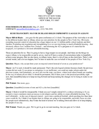 Mayor's Press Release: MAYOR DE BLASIO HOLDS IMPROMPTU GAGGLE IN ALBANY