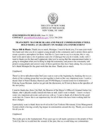 Press Release: TRANSCRIPT: MAYOR DE BLASIO AND POLICE COMMISSIONER O’NEILL HOLD MEDIA AVAILABILITY ON MARIJUANA ENFORCEMENT