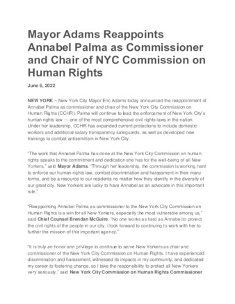 New York City Mayor Eric Adams announces the reappointment of Annabel Palma as commissioner and chair of the New York City Commission on Human Rights (CCHR).