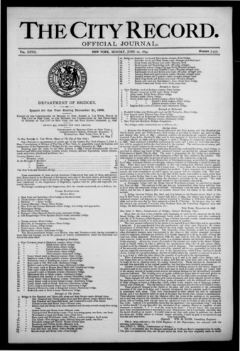 The City Record newspaper publishes notices which includes but is not limited to: public hearings and meetings, public auctions and sales, solicitations and awards and official rules proposed and adopted by city agencies. This is the City Record Newspaper for June 12, 1899.