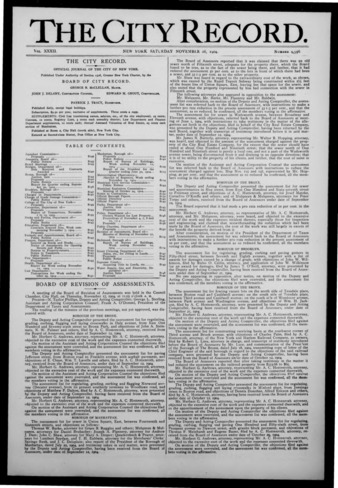 The City Record newspaper publishes notices which includes but is not limited to: public hearings and meetings, public auctions and sales, solicitations and awards and official rules proposed and adopted by city agencies. This is the City Record Newspaper for November 26, 1904.