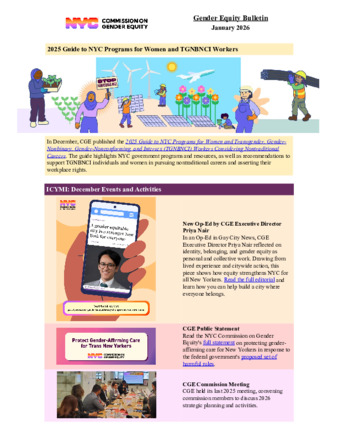 The Gender Equity Bulletin is the Commission on Gender Equity's monthly newsletter sharing CGE's activities from the previous month, upcoming events, and resources.