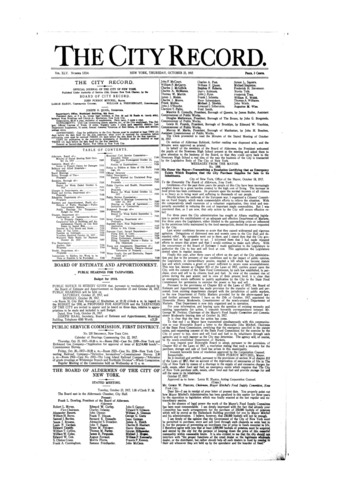 The City Record newspaper publishes notices which includes but is not limited to: public hearings and meetings, public auctions and sales, solicitations and awards and official rules proposed and adopted by city agencies. This is the City Record Newspaper for October 25, 1917.