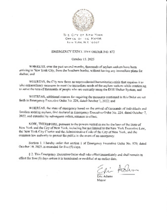 Emergency Executive Order No. 872, is being submitted to extend Emergency Executive Order No. 870, dated October 10, 2025; for five (5) days as it relates to the state of emergency based on the arrival of thousands of individuals and families seeking asylum.