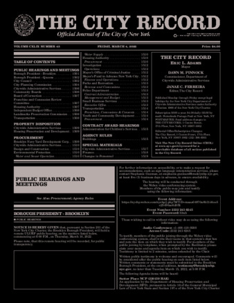 The City Record newspaper publishes notices which includes but is not limited to: public hearings and meetings, public auctions and sales, solicitations and awards and official rules proposed and adopted by city agencies.