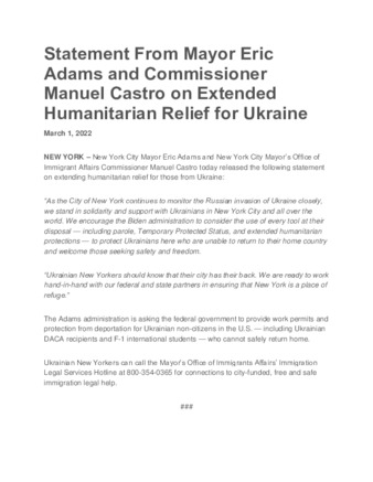 Statement From Mayor Eric Adams and Commissioner Manuel Castro on Extended Humanitarian Relief for Ukraine