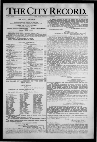 The City Record newspaper publishes notices which includes but is not limited to: public hearings and meetings, public auctions and sales, solicitations and awards and official rules proposed and adopted by city agencies. This is the City Record Newspaper for October 10, 1907.