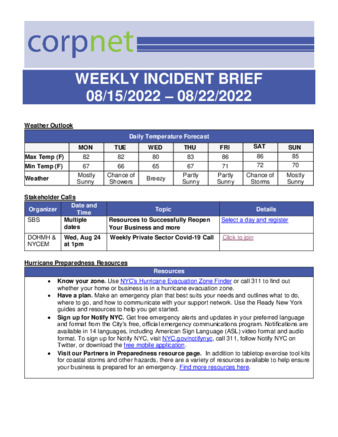 NYCEM CorpNet COVID-19 Weekly Incident Briefs – August 2022