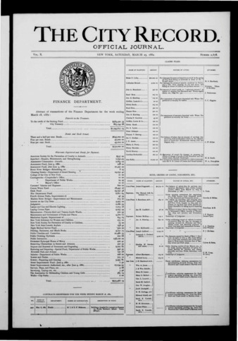 The City Record newspaper publishes notices which includes but is not limited to: public hearings and meetings, public auctions and sales, solicitations and awards and official rules proposed and adopted by city agencies. This is the City Record Newspaper for March 25, 1882.