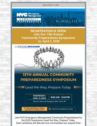 The NYCEM Community Preparedness newsletter provides information about preparedness initiatives, resources and local events to community and faith-based organizations, leaders and the general public of New York City. During emergencies, important alerts and updates are issued to all who subscribe.