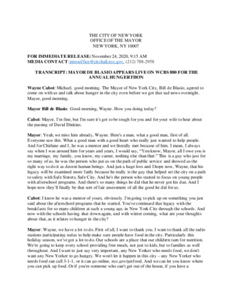 Mayor's Press Release: MAYOR DE BLASIO APPEARS LIVE ON WCBS 880 FOR THE ANNUAL HUNGERTHON
