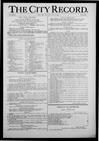 The City Record newspaper publishes notices which includes but is not limited to: public hearings and meetings, public auctions and sales, solicitations and awards and official rules proposed and adopted by city agencies. This is the City Record Newspaper for July 29, 1905.