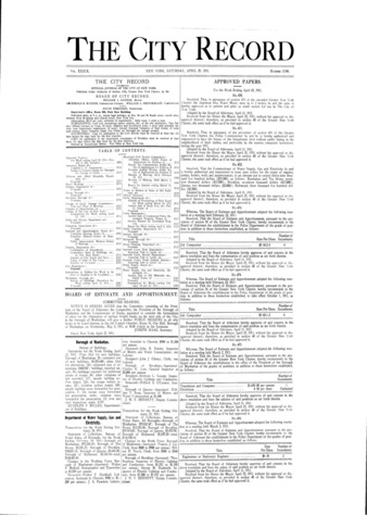 The City Record newspaper publishes notices which includes but is not limited to: public hearings and meetings, public auctions and sales, solicitations and awards and official rules proposed and adopted by city agencies. This is the City Record Newspaper for April 29, 1911.