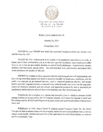 Executive Order No. 58, dated October 28, 2025 is being submitted whereas it is a priority of this Administration to encourage employee wellness and to ensure the programs offered and supported by WorkWell NYC are integrated into all City agencies available to all NYC employees; this order is Final.