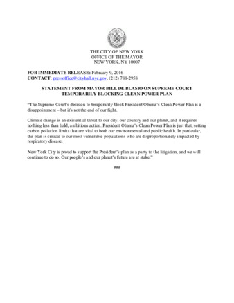 Mayor's Press Release: STATEMENT FROM MAYOR BILL DE BLASIO ON SUPREME COURT TEMPORARILY BLOCKING CLEAN POWER PLAN