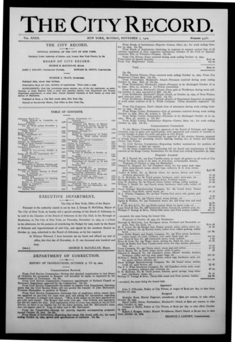 The City Record newspaper publishes notices which includes but is not limited to: public hearings and meetings, public auctions and sales, solicitations and awards and official rules proposed and adopted by city agencies. This is the City Record Newspaper for November 07, 1904.