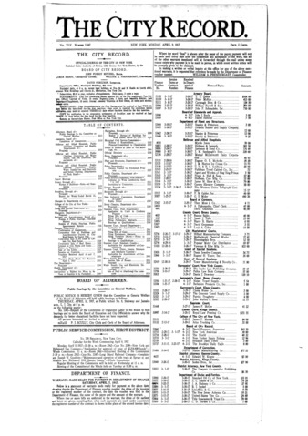The City Record newspaper publishes notices which includes but is not limited to: public hearings and meetings, public auctions and sales, solicitations and awards and official rules proposed and adopted by city agencies. This is the City Record Newspaper for April 09, 1917.
