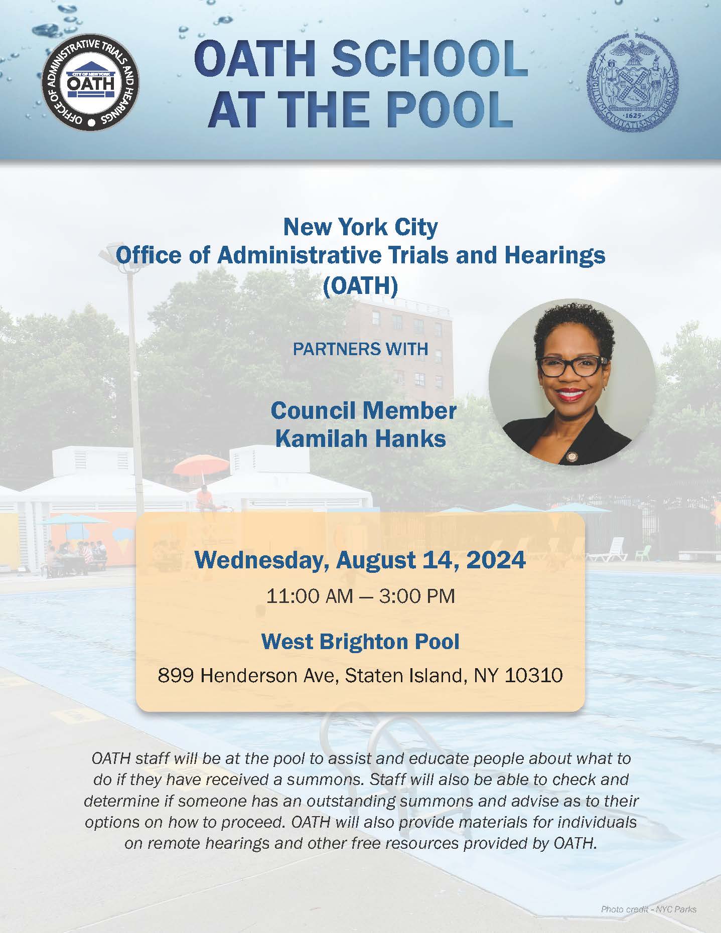 OATH staff were at the pool to assist and educate people about what to do should they have received a summons and to check to determine if someone has an outstanding summons. Materials about remote hearings and other free resources were provided to the public as well.