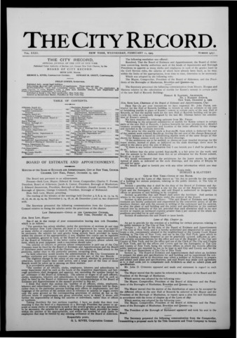 The City Record newspaper publishes notices which includes but is not limited to: public hearings and meetings, public auctions and sales, solicitations and awards and official rules proposed and adopted by city agencies. This is the City Record Newspaper for February 11, 1903.