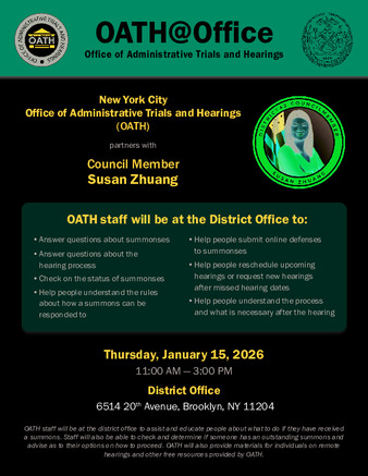 OATH staff were at the district office to assist and educate people about what to do should they have received a summons and to check to determine if someone has an outstanding summons. Materials about remote hearings and other free resources were provided to the public as well.