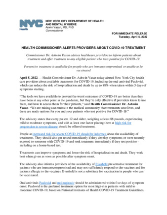 The New York City Department of Health and Mental Hygiene published this press release titled, "Health Commissioner Alerts Providers About COVID-19 Treatment", on April 5, 2022.
